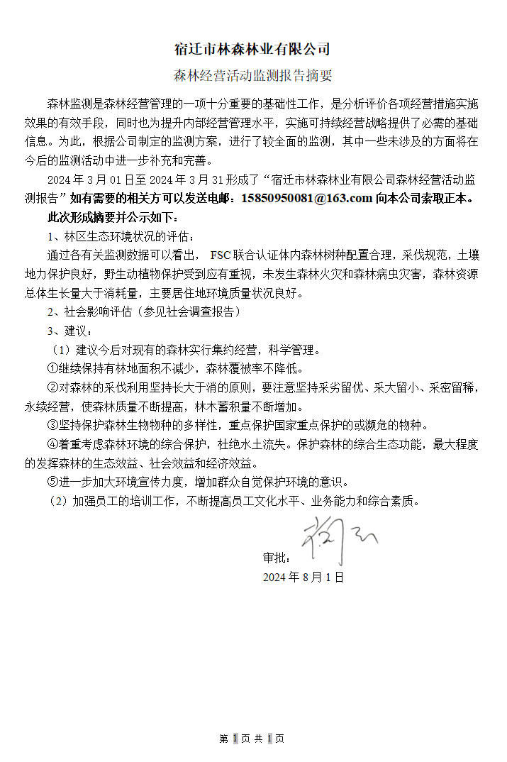 公示摘要2-森林經(jīng)營活動監(jiān)測報(bào)告摘要-宿遷市林森林業(yè)有限公司
